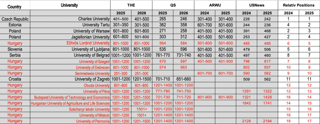 Looking at the four rankings together, it is clear that the ranking of Hungarian universities has not changed at all in the former Soviet sphere of influence. ELTE continues to lead the second group, directly behind the four leading institutions (Charles University in Prague, the University of Tartu in Estonia, and the two Polish institutions, Jagiellonian University and the University of Warsaw). Szeged, Debrecen, and Semmelweis, which are ranked after Ljubljana, Belgrade, and Zagreb. The other Hungarian institutions are mostly in the second thousand group of universities measured by the rankings, with the exception of the Technical University’s 700-800 category on the QS and ARWU lists and Pécs’s better QS ranking.